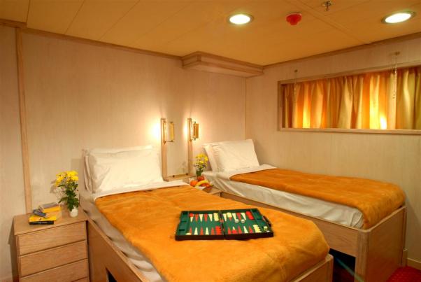 Двухместная каюта на верхней палубе. В каюте: одна семейная или две раздельных кровати, окна, душ/туалет, кондиционирование, центральная музыкальная радиоточка, внутренний телефон, сейф, фен и банные принадлежности.